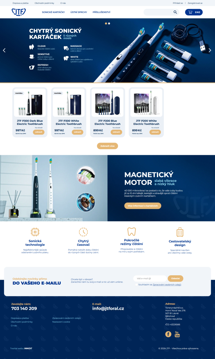 https://www.jtforal.czPod rukama našeho vývojového týmu vznikl nový malý e-shop se sonickými zubními kartáčky a příslušenstvím. Jeho administraci jsme připravili na míru klientovi, aby ho mohl pohodlně spravovat.