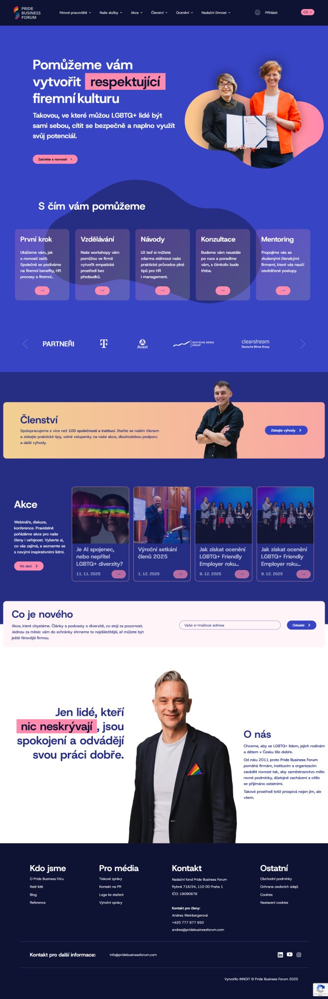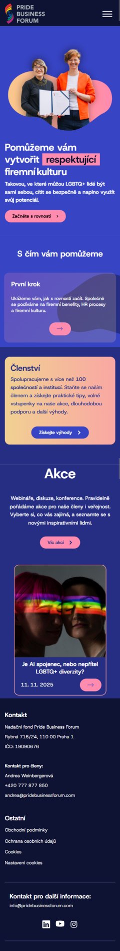 https://www.pridebusinessforum.comPro projekt Pride Business Fórum jsme vytvořili zcela nový web plný funkcí, které napomáhají hladkému chodu celé organizace. Webové stránky zároveň slouží jako centrální platforma pro podporu LGBTQ+ diverzity a inkluze na pracovištích.