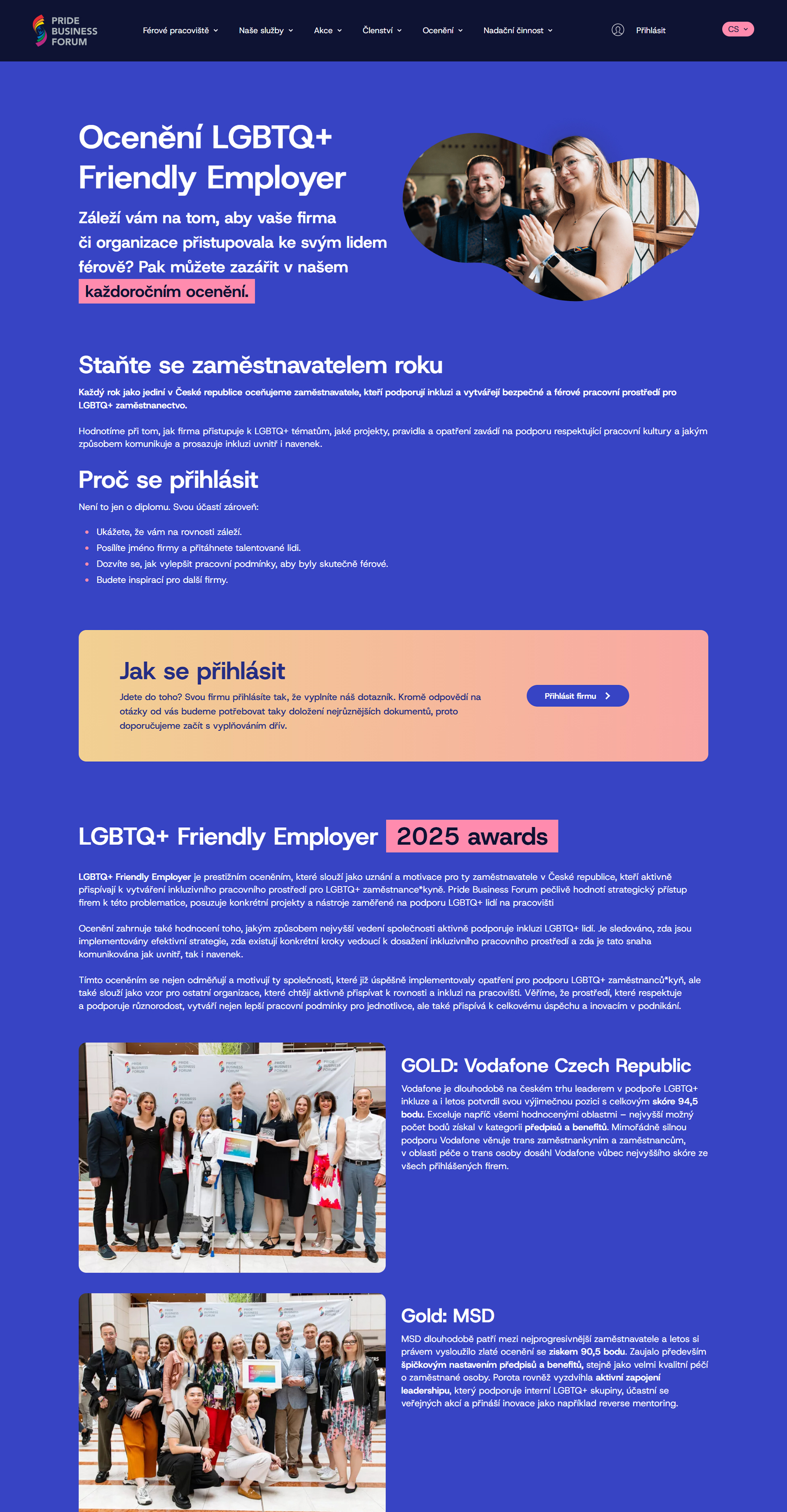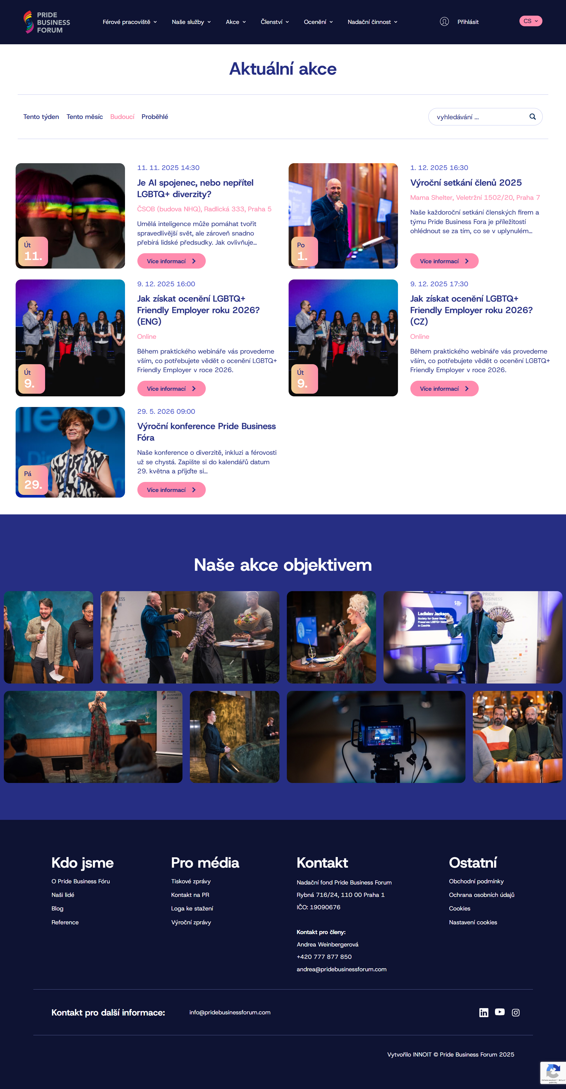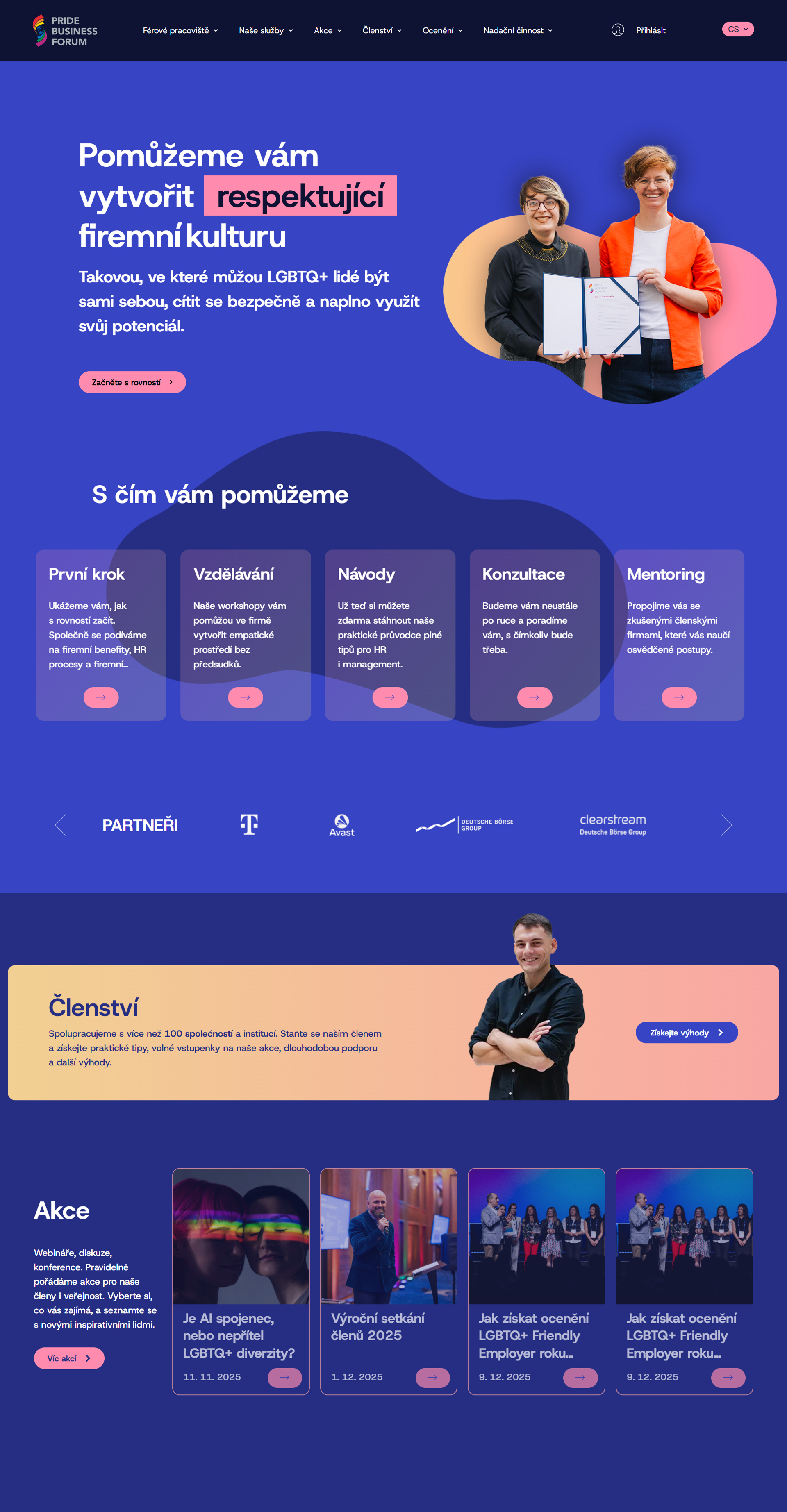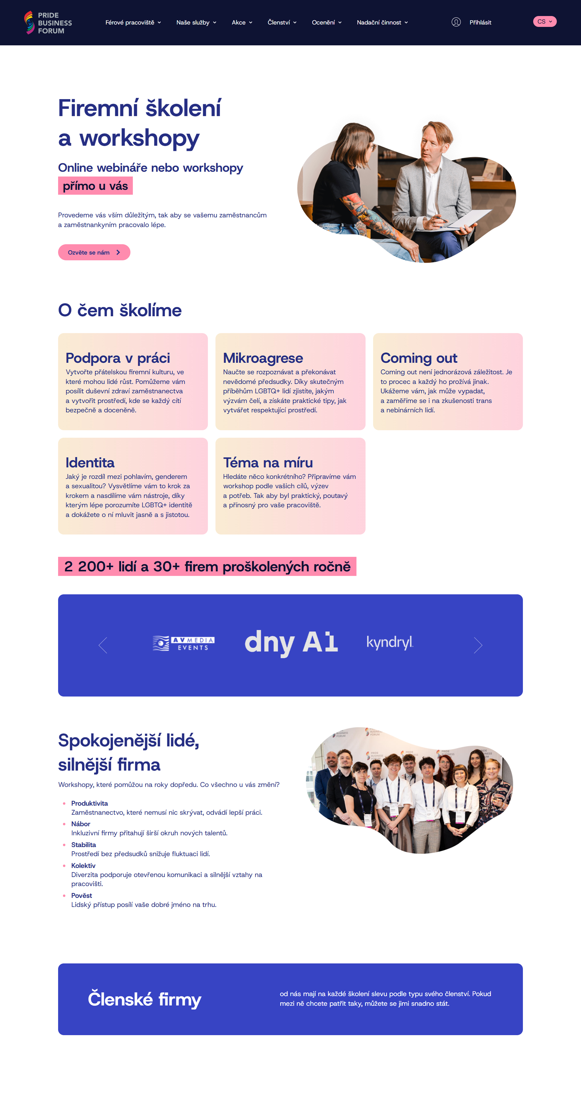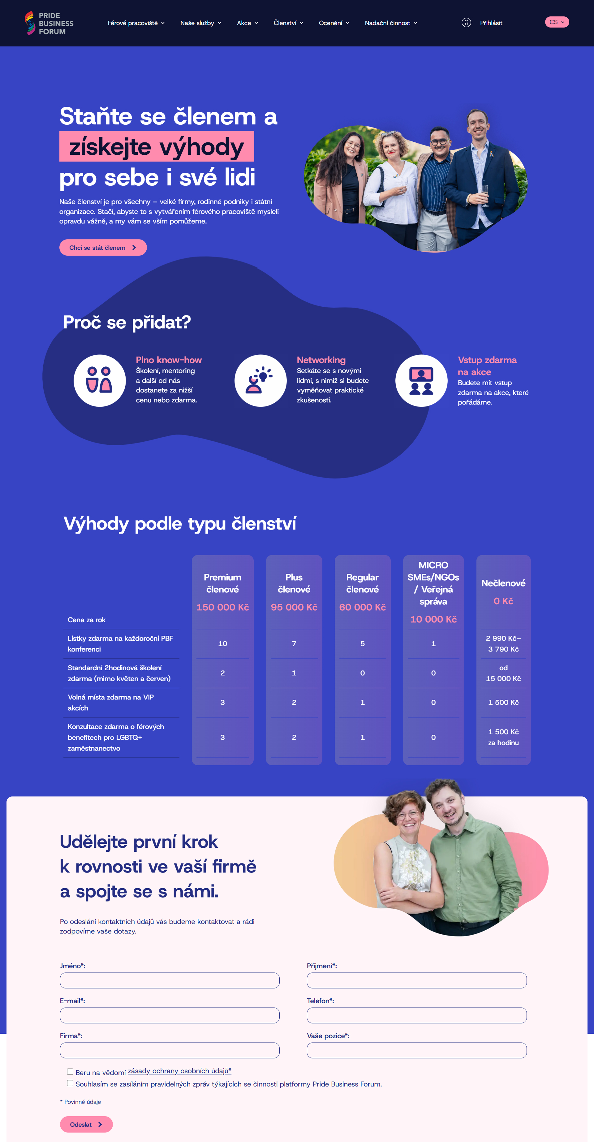 Obsáhlý web je plný kontaktních formulářů propojených s databází Ecomail, díky kterým mohou být zájemci o členství, školení, workshopy či nadační podporu rychle a snadno ve spojení se členy týmu Pride Business Fórum.